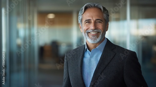 Man with gray hair and beard wearing a suit smiles in a contemporary office space filled with natural light