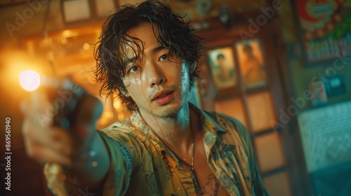 Man With Long Hair Holding A Gun In A Bar At Night