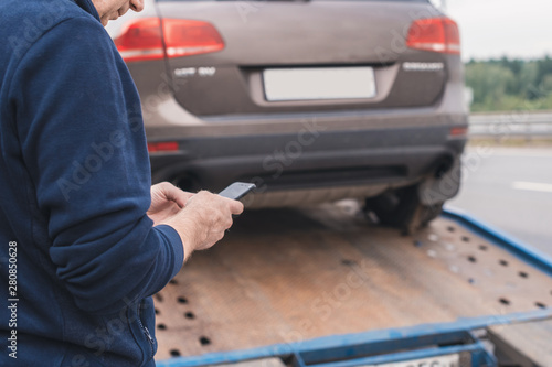 Man with mobile phone.Tow truck with worker towing a broken down car on the highway. Selective focus. Concept