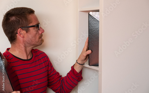 MAN WITH RED T-SHIRT, BLUE TROUSERS AND BLACK GLASSES, TAKING FILES FROM THE WHITE SHELF IN HIS ROOM