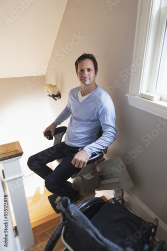 transportation, home, business, professional, career, portrait, sitting, corporate, us, hunt, step, mark, disabled, wheelchair, accessible, accessibility, staircase, assistance, convenience, disability, motorized, massachusetts, new england, half face, one person, special needs, indoor, vertical, mobility, full-length, one man only, caucasian appearance, paraplegia