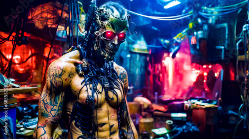 man, adult, futuristic, skittish, halloween, horror, tattoo, dark, night, creativity, evil, robot, working, woman, metal, animal, male, fantasy, flames, portrait, indoor, industry, danger, torso, human, hand, technology, hell, death, occupation, machinery, head, shock, standing, blood, workshop, young, science, stage, bizarre, equipment, naked, fear, muscular, build, performance