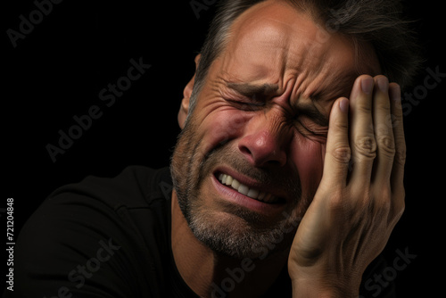 Man with toothache touching cheek with painful expression
