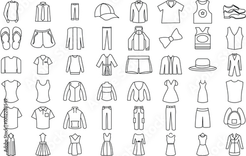 clothes, clothing, man, woman, dress, shirt, fashion, suit, pant, illustration, vector, jacket, t-shirt, icon, symbol, shoe, set, apparel, skirt, accessory, female, outline, short, textile, wear, coat, collection, design, hat, store, trousers, sweater, necktie, shopping, male, belt, jean, underclothing, retail, shop, garment, boot, isolated, bag, sock, style, clip art