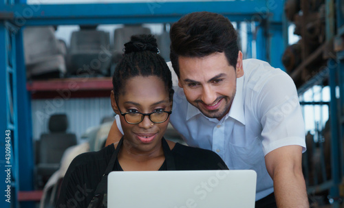 Man work with woman, they smile and using laptop. Diversity of two people, caucasian business manager and African worker woman happy to use laptop in factory-warehouse