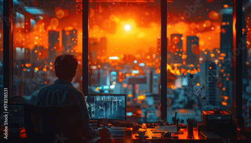 man, working, computer, city, view, window, office, night, light, city landscape, desk, keyboard, monitor, sunset, silhouette, urban, technology, programmer, developer, business, work, laptop, hot drink, cup, dark, shadow, sharpened, blur, glasses, building, street, street light, glow, orange, red, blue, mood, atmosphere, modern, minimal, abstract, background, design, art