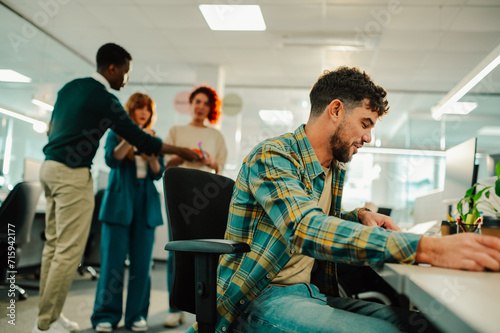 Man working at his desk and his diverse colleagues are preparing surprise party