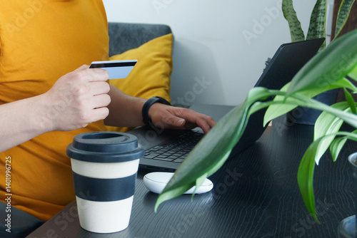 online, payment, credit, card, laptop, man, working, home, freelancer, office, shopping, commerce, technology, cyberspace, digital, nomad, remote, work, buying, finance, business, transaction, secure, computer, desk, hot drink, houseplant, modern, lifestyle, comfortable, cosy, productivity, life, balance, wireless, mouse, keyboard, typing, holding, middle, aged, casual attire, yellow, shirt, smart, watch, interior, indoor