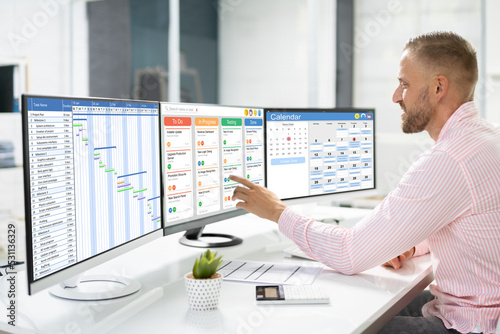 schedule, report, working, man, multiple, board, report, using, scheduling, software, chart, computer, calendar, agenda, list, appointment, screen