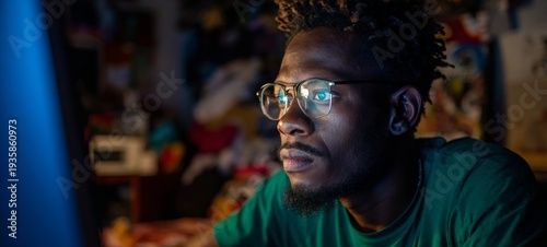man, technology, work, room, computer, screen, goggles, shirt, jean, music, earphones, earbud, late, night, sharpened, concentration, productivity, gaming, entertainment, home, indoor, personal, space, life, modern, contemporary