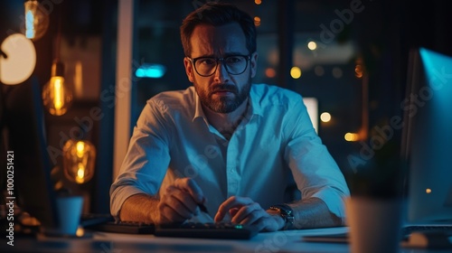 man, office, working, computer, focused, technology, goggles, business, professional, desk, serious, modern, night, concentrated, work, job, monitor, workplace, male, keyboard, lamp, intelligent, thoughtful, corporate, casual attire, deadline, overtime, indoor, portrait, adult, young men, lifestyle, career, productivity, equipment, cyberspace, screen, communication, connection, urban, professional occupation, person, contemporary