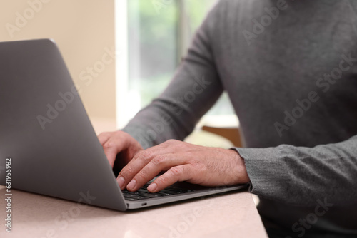 Man working on laptop at table in cafe, closeup