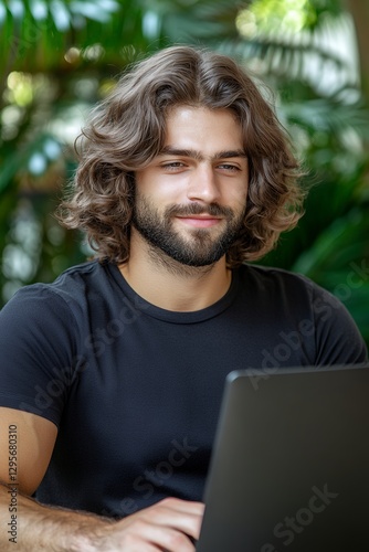 man, laptop, working, sharpened, curly, hair, beard, garden, plant, tropical, semitropical, natural, light, soft, computer, t-shirt, stylish, technology, professional, serious, concentrated, productive, engagement, relaxed, attire, brown, grey, shirt, work, from, home, remote, digital, nomad, casual attire, wear, portrait, close, up, business, contemporary, modern, fresh, outside, green, background, gentle, lighting