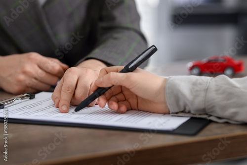 Manager and client signing car purchase agreement at wooden table, selective focus. Buying auto