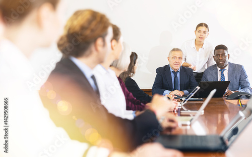 woman, female, businesswoman, employee, office, meeting, room, indoor, interior, portrait, people, adult, emotion, laptop, positive, polite, interested, successful, communication, business, startup, teamwork, partnership, concept, agreements, competence, professional, manager, occupation, activity, lifestyle, caucasian, european, german, austrian, 30s, african, american