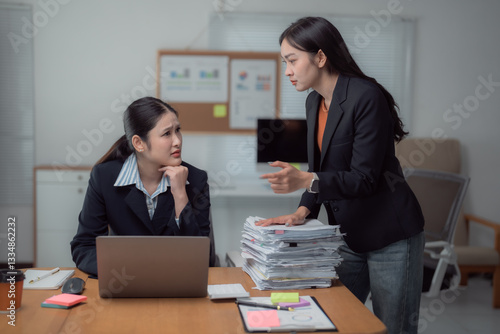 arguing, mistake, paperwork, scolding, accusation, conflict, confrontation, disagreement, challenged, frustration, stress, tension, anger, office, work, business, manager, employee, woman, businesswoman, colleague, communication, problem, laptop, computer, desk, document, file, career, corporate, job, responsibility, pressure, deadline, overworked, burnout, emotion, expression, human relationships, conversation, interaction, professional, workplace, boss, subordinate