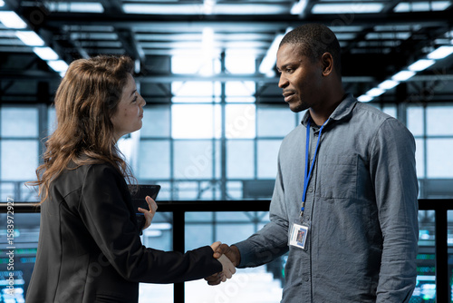 Manager meeting with computer scientist in data center, coming to inspect servers. Supervisor doing handshake with system administrator in server room, overseeing supercomputers