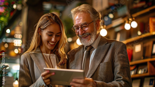 Managing director in grey suit with company or assistant having business meeting associates working together on task new startup idea, teamwork help or synergy concept, happy and holding a tablet