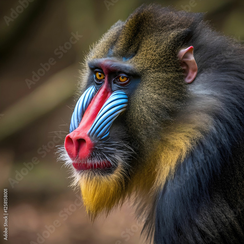 no people, photo, color image, closeup, mandrill, mammal, primate, one animal, baboon, nature, animal head, horizontal, vertical, monkey, animal, animal themes, outdoors, vertebrate, ape, front view, portrait, blue, looking away, red, yellow, black background, day, endangered species, africa, carrying, displeased, noise, symmetry, violence, walking, alertness, carnivorous, copy space, singapore, studio shot, drill, france, german, national park