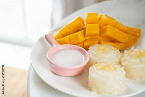 Mango tropical fruit and sticky rice with coconut juice. Thai dessert.