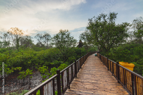 Mangrove Forest with walking path for visitors made from wood. View of Mangrove Forest in Wonorejo Mangrove Forest, Surabaya, East Java, Indonesia.