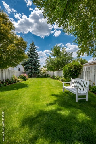 garden, lawn, grass, green, backyard, fence, wood, wooden, tree, shade, bench, white, sky, blue, cloud, summer, spring, home, house, nature, landscape, manicured, neat, clean, fresh, plant, foliage, environment, suburban, suburb, lifestyle, relax, leisure, space, area, ground, field, turf, park, view, scene, background, sunny, day, bright, light, peaceful, quiet