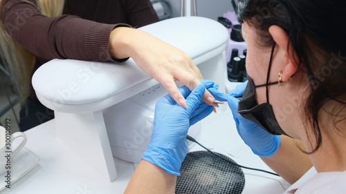 Manicurist paints nails to a client in a beauty salon. Gel polish. Lacquer. Manicure. Nail extension