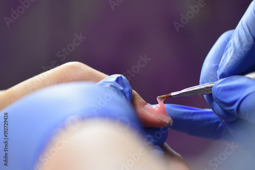 Manicurist with a brush applied to the nails a special gel