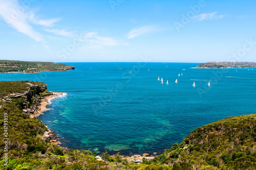 Manly Beach coastal walk with view on Watson Bay in Sydney with yacht sailing and azure clear water in summer (Sydney, Australia)
