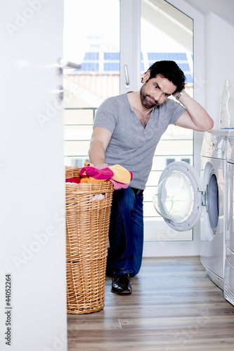 Mann ist verzweifelt bei so viel Wäsche für die Waschmaschine