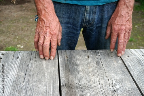 Mann mit blauer Jeanshose hält Hände über grauer Lattenholztischplatte in Garten am Abend im Sommer