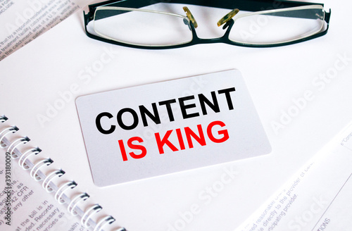 Man's hand holding a business card with text Content Is King. Notepad with eyeglasses and text documents
