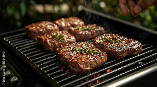 Man's hand seasons meat on an outdoor gas grill during a backyard summer picnic, featuring juicy steaks and smoky flavor