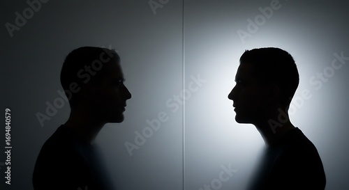 silhouette, man, mirror, identity, introspection, shadow, light, dark, contrast, profile, portrait, self, abstract, concept, mental, mind, thinking, emotion, psychology, mysterious, dramatic, facing, face, side, modern, creative, art, design, solitude, contemplation, explore, inner, feeling, human, person, thought, monochrome