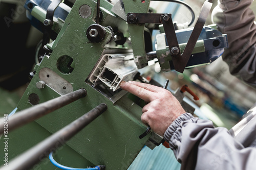 Manual worker cutting aluminum and PVC profiles. Manufacturing jobs. Selective focus. Factory for aluminum and PVC windows and doors production.