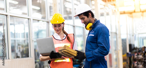 Manufacturing Factory female Mechanical Engineering programer Works on Personal Computer and man worker are working with Robotic Arm at industrial factory