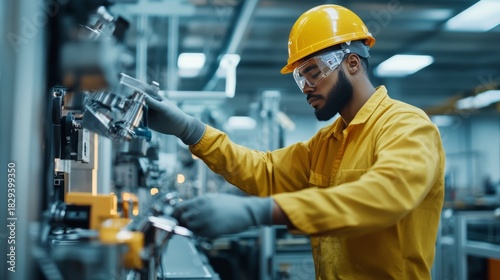 Manufacturing process action skilled worker operates machinery in industrial setting highlighting precision and safety in production