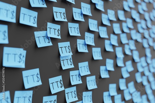 Many blue stickers on black board background with symbol of Trinidad and Tobago dollar drawn on them. Closeup view with narrow depth of field and selective focus. 3d render, illustration