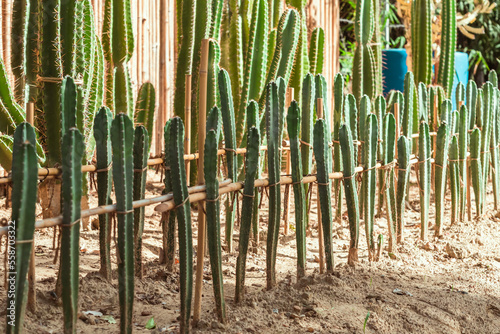 Many cactus plants to decorate the garden.Cultivation of beautiful cactus species as hobby and selling. Industrial cactus farm in farmhouse with different types of cacti and succulents grown for sale.