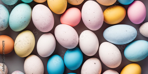 Many colorful Easter eggs in a stack with various pastel colors in the spring season
