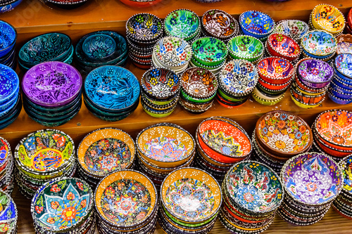 Many colorful souvenir plates for sale at the bazaar in Turkey