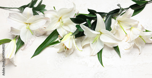 Many delicate lily flowers on light background