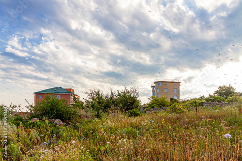 Many dragonflies in a cloudy, summer sky.