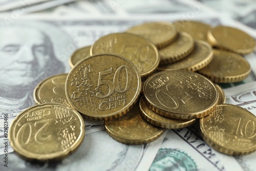 Many euro coins on dollar banknotes, closeup