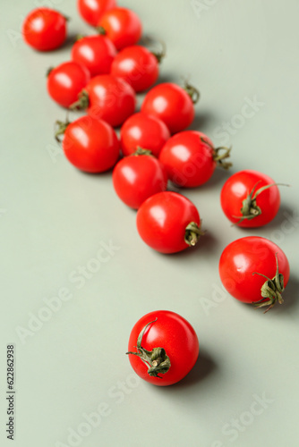 Many fresh cherry tomatoes on grey background