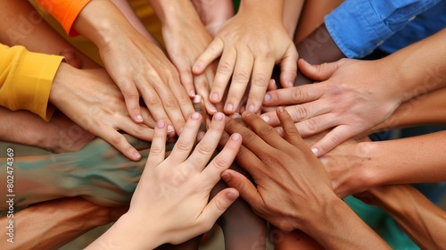 Many hands come together in a circle, blending diverse individuals, symbolizing unity, cooperation, and community collaboration, illustrating the power of togetherness.