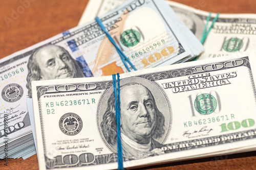 Many hundred dollar bills on wooden table background texture. bundles of money scattered on the office desk. wealth and income concept
