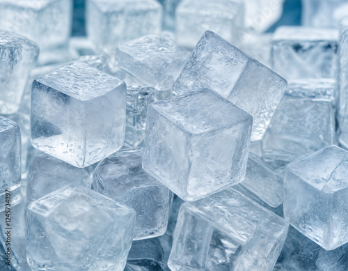 Many natural crystal clear small ice cubes as background, fresh and cool vibe, light background, close up, top down view, flatlay