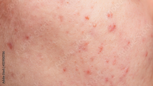 Many pimples. Bad skin. Hormonal acne, puberty. Skin acne background. Closeup acne pimple. Treatment for acne skin. Problem skincare. Pimples, pores, scars. Skincare treatment.