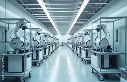 Many robots work in cleanroom environment. They perform precise operation. Scene shows advanced tech and automation. Teamwork and precision are key. Location suggests high-tech manufacturing facility.